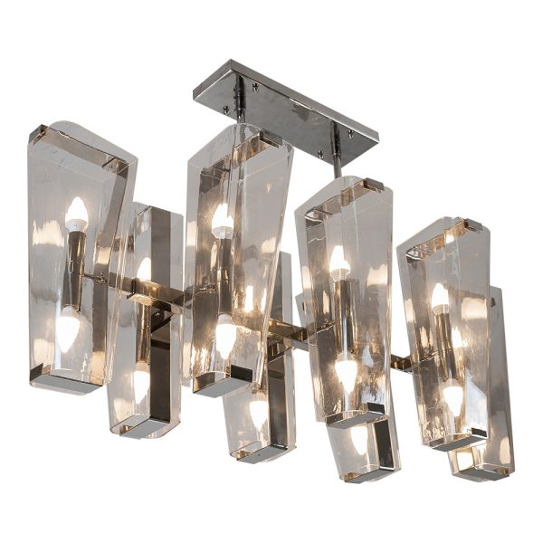 Colgante estilo moderno, modelo AC174, color: cromo, con plafón de metal y 8 pantallas de vidrio translúcido. Caída máxima: 112 cms.